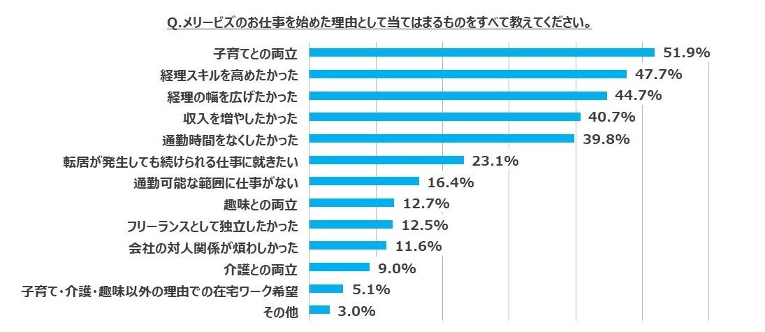 「メリービズを始めた理由」に関する設問で「子育てとの両立」を回答した人は51.9%と半数以上となりました。出産・育児といったライフステージの変化に合わせ、柔軟な働き方を考え始めたことがきっかけでメリービズを選択する人も多いようです。
