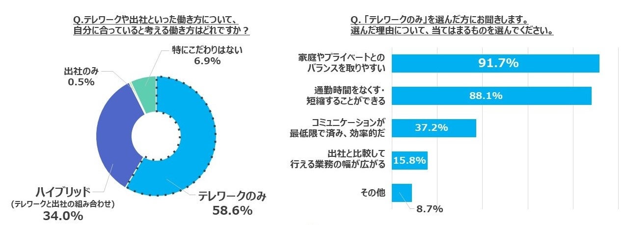 「自分に合っていると考える働き方」に関する設問では「テレワークのみ」の回答が58.6%、「ハイブリッド(テレワークと出社の組み合わせ)」が34.0%となり、9割以上がテレワークを含む働き方を希望していることがわかりました。