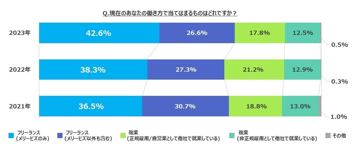 なお、メリービズでの働き方について「フリーランス(メリービズのみ)」と回答した人の割合は2021年調査から毎年増加しており、2023年では42.6%を占めています。