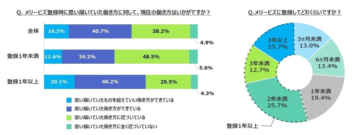 「思い描いていたものを超えて良い働き方ができている」「思い描いていた働き方ができている」という「実現できている」趣旨の回答をした人の割合を「メリービズ登録期間の長さ」の観点からみると、登録して1年未満の人では46.0%、1年以上経過している人では66.2%と大きな差がみられました。