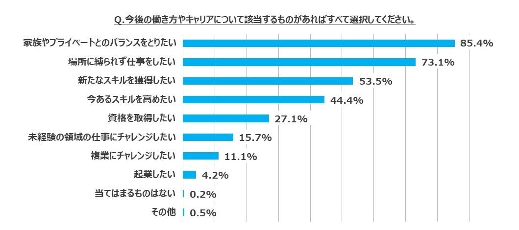 5. 今後の働き方・キャリアの希望としては「家族やプライベートとのバランスを大切にしたい」が昨年に引き続き最多で85.4%と唯一8割以上の回答数となりました。