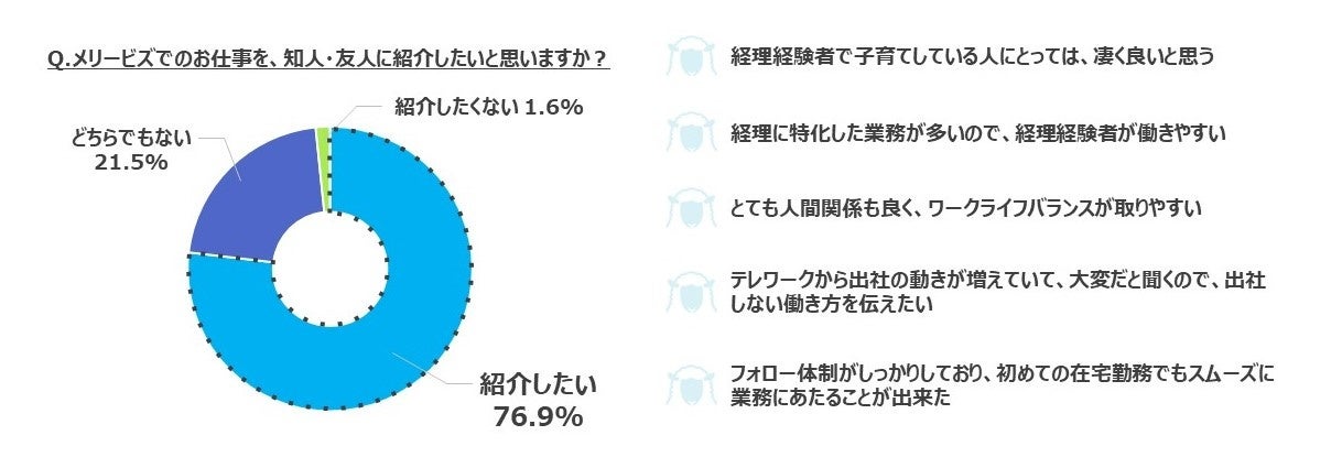 「メリービズでのお仕事を、知人・友人に紹介したいと思いますか?」に対して、76.9%が「紹介したい」と回答し、昨年、一昨年と同じく7割を超える結果となりました。理由として寄せられたコメントを一部ご紹介します。