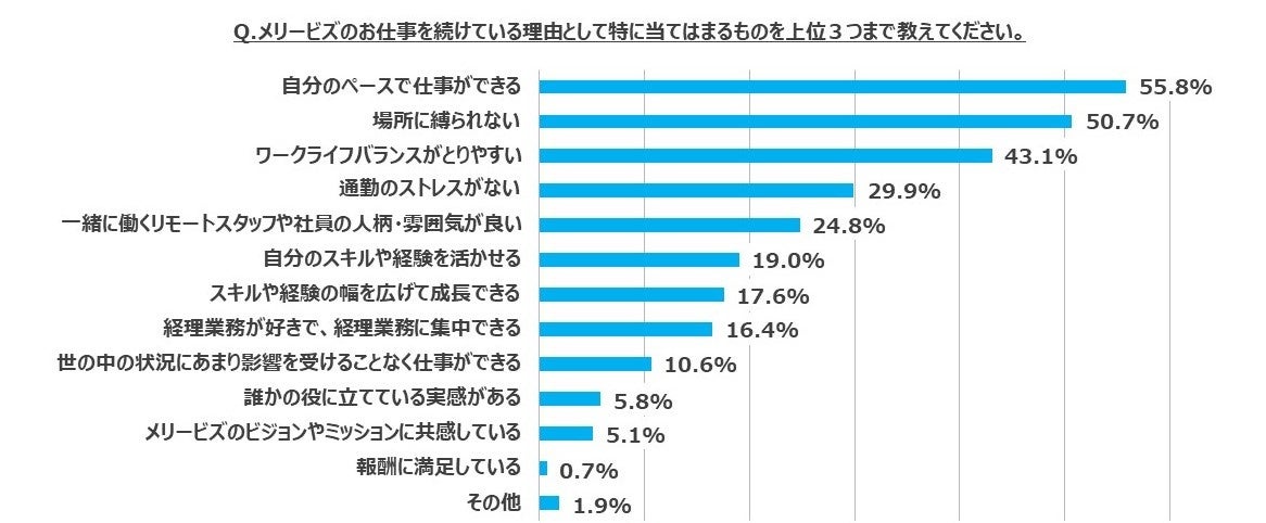 4. メリービズでの仕事を始めた理由は「子育てとの両立」、「経理スキルを高めたかった」であるのに対し、続けている理由の上位3つはワークライフバランスに関するものが占めています。