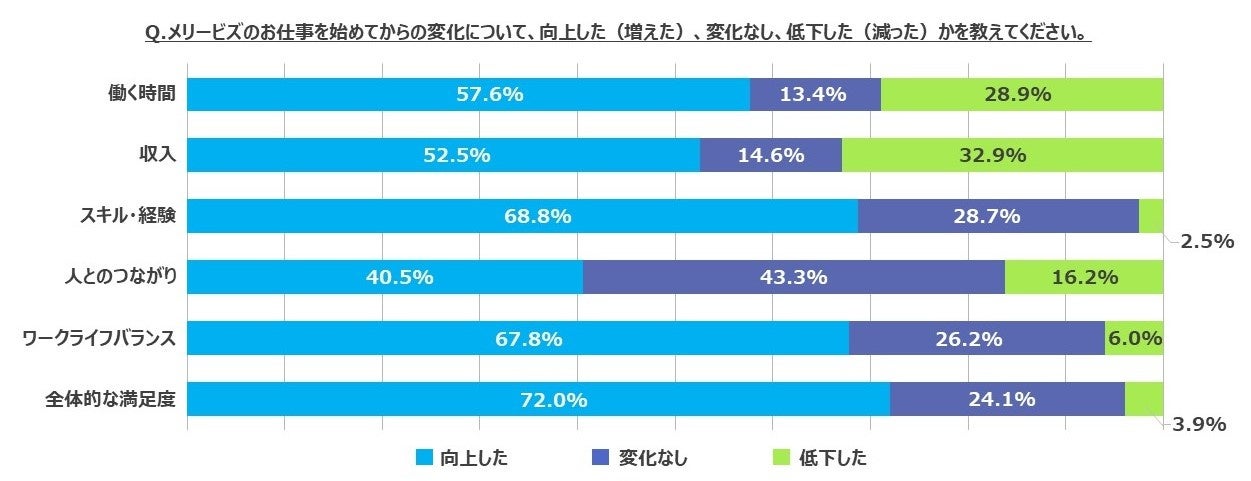 背景としては、長期的に働くことでメリービズでの働き方に慣れ、ワークライフバランスをはじめとした自身の業務環境がコントロールがしやすくなることや、受託する仕事量を少しずつ増やしていくことで徐々に希望の報酬に近づいていくことなどが考えられます。