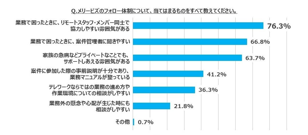 メリービズのフォロー体制を問う設問では、全体の76.3%が「業務で困ったときに、リモートスタッフ・メンバー同士で協力しやすい雰囲気がある」と回答し、最も多い結果となりました。また、「業務で困ったときに、案件管理者に聞きやすい」が66.8%、「家族の急病などプライベートなことでも、サポートしあえる雰囲気がある」が63.7%となり、全体の6割以上がチームで取り組むことへの安心感や、業務環境に対してのポジティブな印象を持っていることがわかりました。