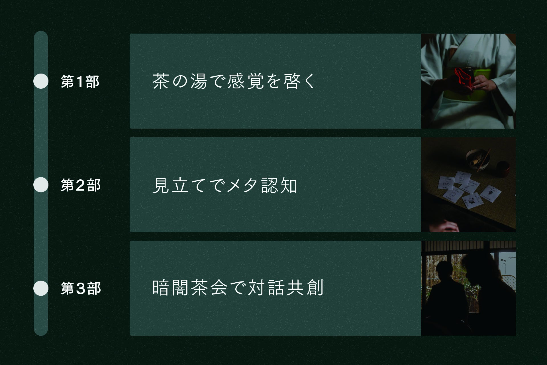 「忙しさに追われ、数字に縛られ、正解ばかりを求め続ける毎日。AIの台頭も相まって、現状に対する違和感や漠然とした不安を感じている。そして、これまでの論理的思考に偏ったアプローチや課題解決手法に、どこか限界を覚えている」──そんな現代のビジネスパーソンと組織に対して、日本古来から続く文化である茶の湯という「別解」を通じて、日常ではたどり着けない、深い対話共創の時間をつくります。