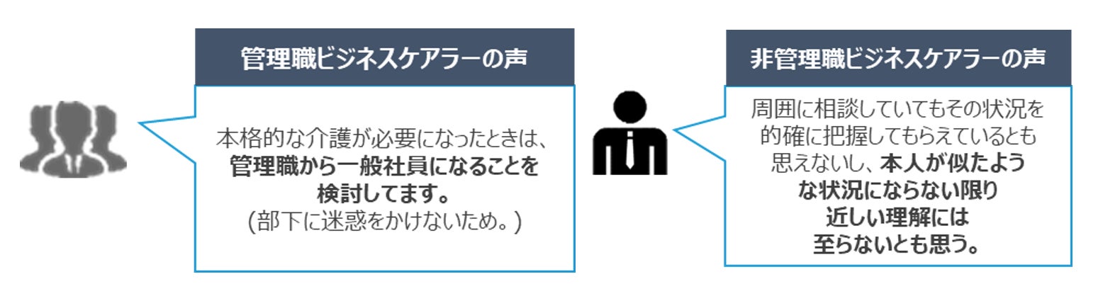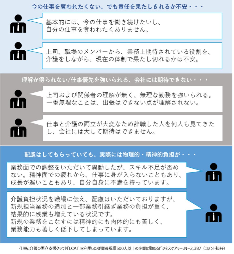 寄せられたビジネスケアラーの声には、「やりがいを奪われたくない」一方で、「無理を強いられると辛い」、「配慮されているとしても」物理的・精神的負担はそれなりに辛い、という実態が見えてきています。