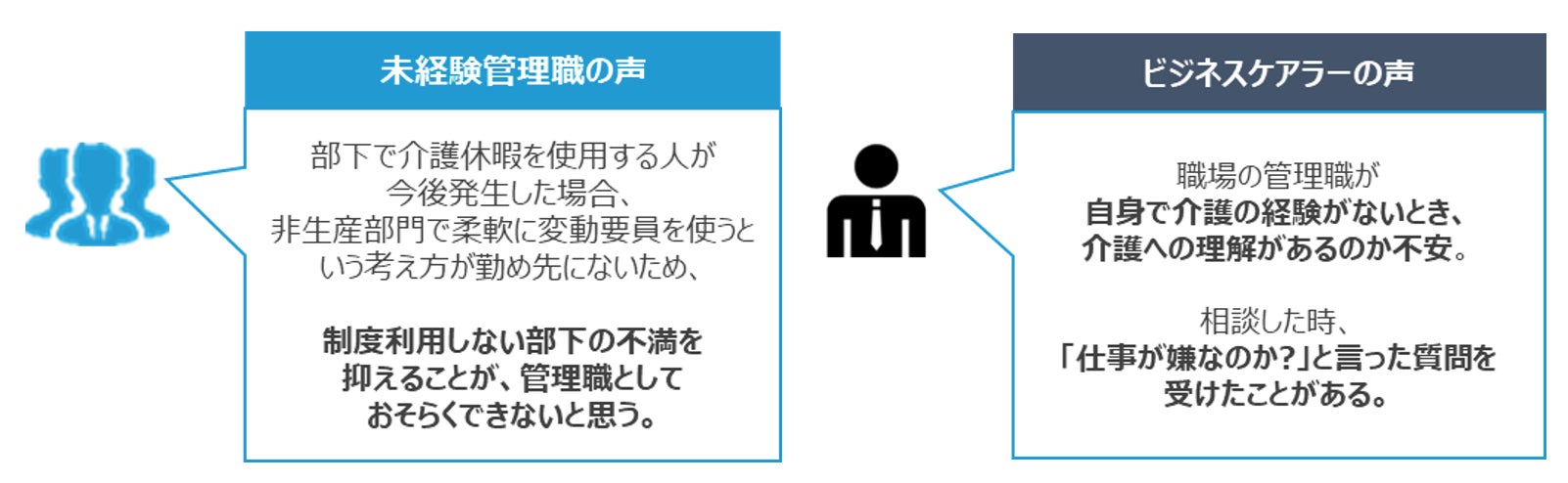 寄せられた声からは、実際に部下が連続休暇を取ることによるタスク調整の難しさや、そもそも介護との両立についての理解・リテラシーが不足しているがゆえの、「仕事に専念か介護に専念か」という究極の選択を、管理職が想定してしまいがちな構造が浮き彫りとなっています。