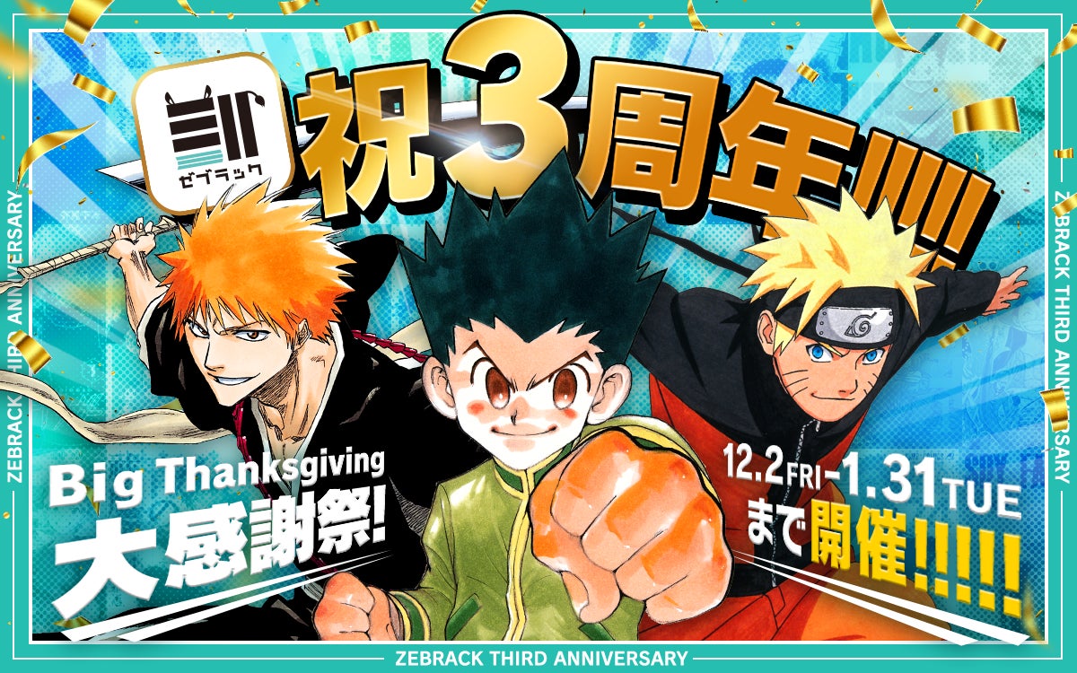 集英社の総合電子書店ゼブラックが3周年を迎えます。12月2日(金)~2023年1月31日(火)まで「3周年大感謝祭」大開催‼