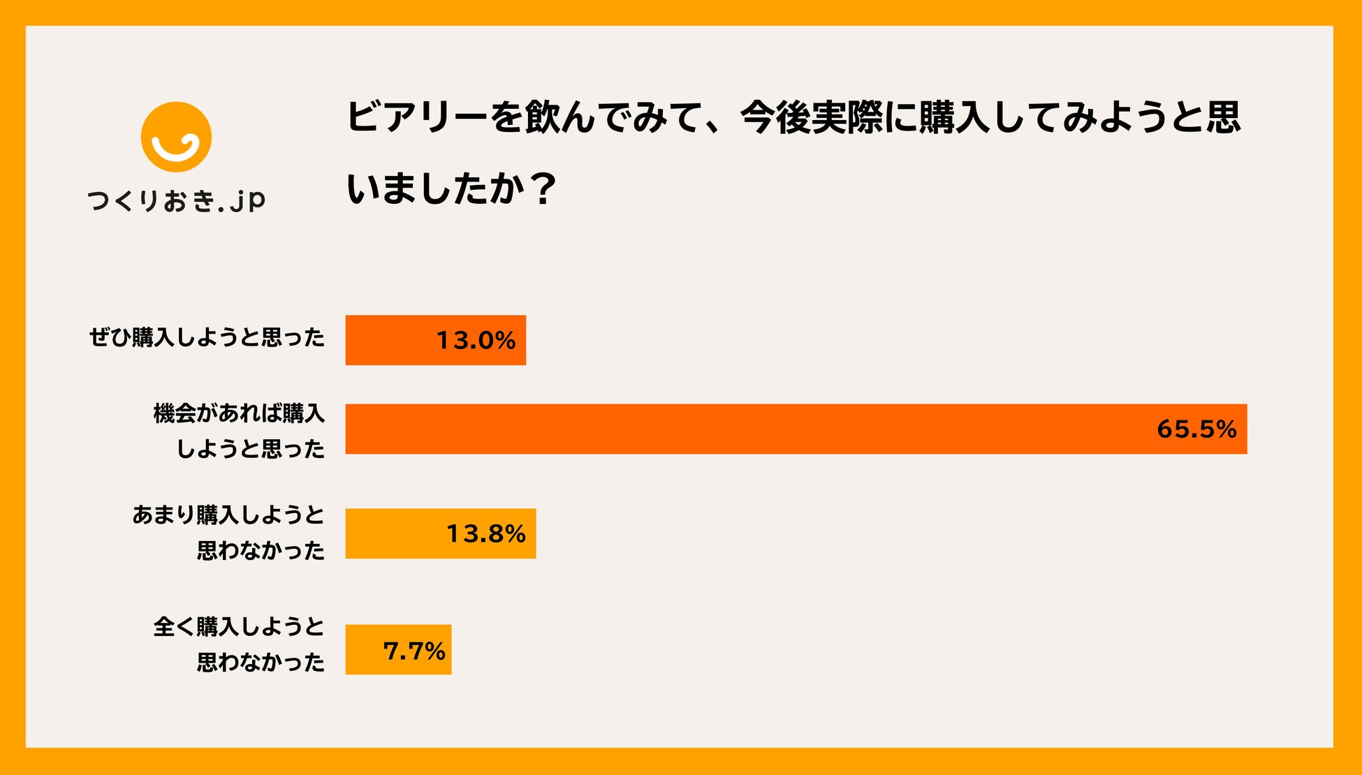 サンプリング実施後のアンケートでは、サンプリングを受け取った人の79%が、今後実際にビアリーを「購入しようと思った」と回答しました*。この結果から、サンプリングによる商品体験が今後の購入意欲に繋がることが示されました。
