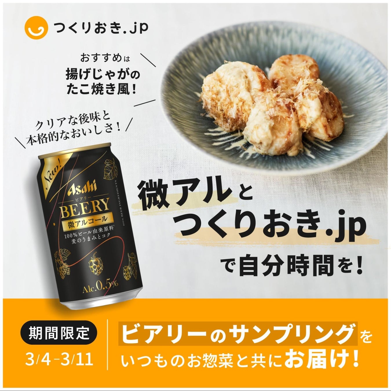 Antwayではすでに、アサヒビールの微アルコール飲料「ビアリー」のサンプリングを受注し、2024年3月4日(月)〜3月11日(月)にかけて、 つくりおき.jp を利用する約4000世帯に向けて配布を行いました。
