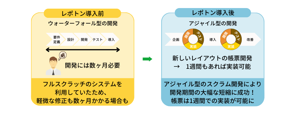 レポトンはノーコードでの構築が可能で、kintoneの画面内で帳票のデザイン作成まで完結できます。そのため、新しいレイアウトの帳票をリリースするにあたり従来のウォーターフォール型では数か月かかっていた期間が、レポトンを導入することでわずか1週間に短縮することが可能になりました。