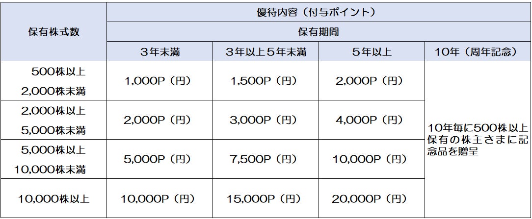 ・長期間保有に対する優遇措置:保有期間3年以上5年未満の株主さまにポイント1.5倍付与