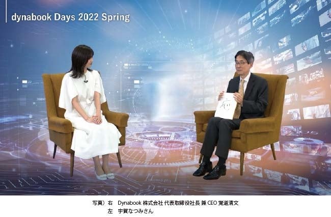 発表会の最後に、司会の宇賀なつみさんによる覚道清文 代表取締役社長 兼 CEOへの新春インタビュー映像が紹介され、「今年のDynabook社はさらなる高みを狙い次のステップへと飛躍してまいります。今後も新しいデバイスや、新しいサービス・ソリューションの創出を推し進め、顧客や取引先様のご支持を得ながら、持続的利益を創出する企業としての取組みを加速いたします。」と力強く述べた。