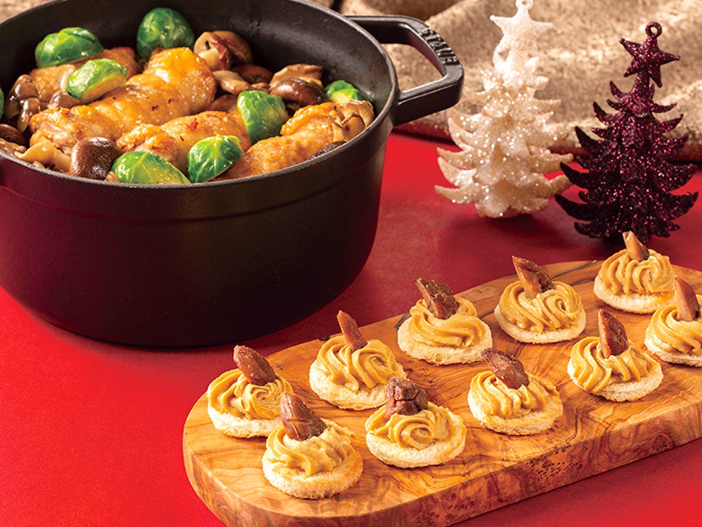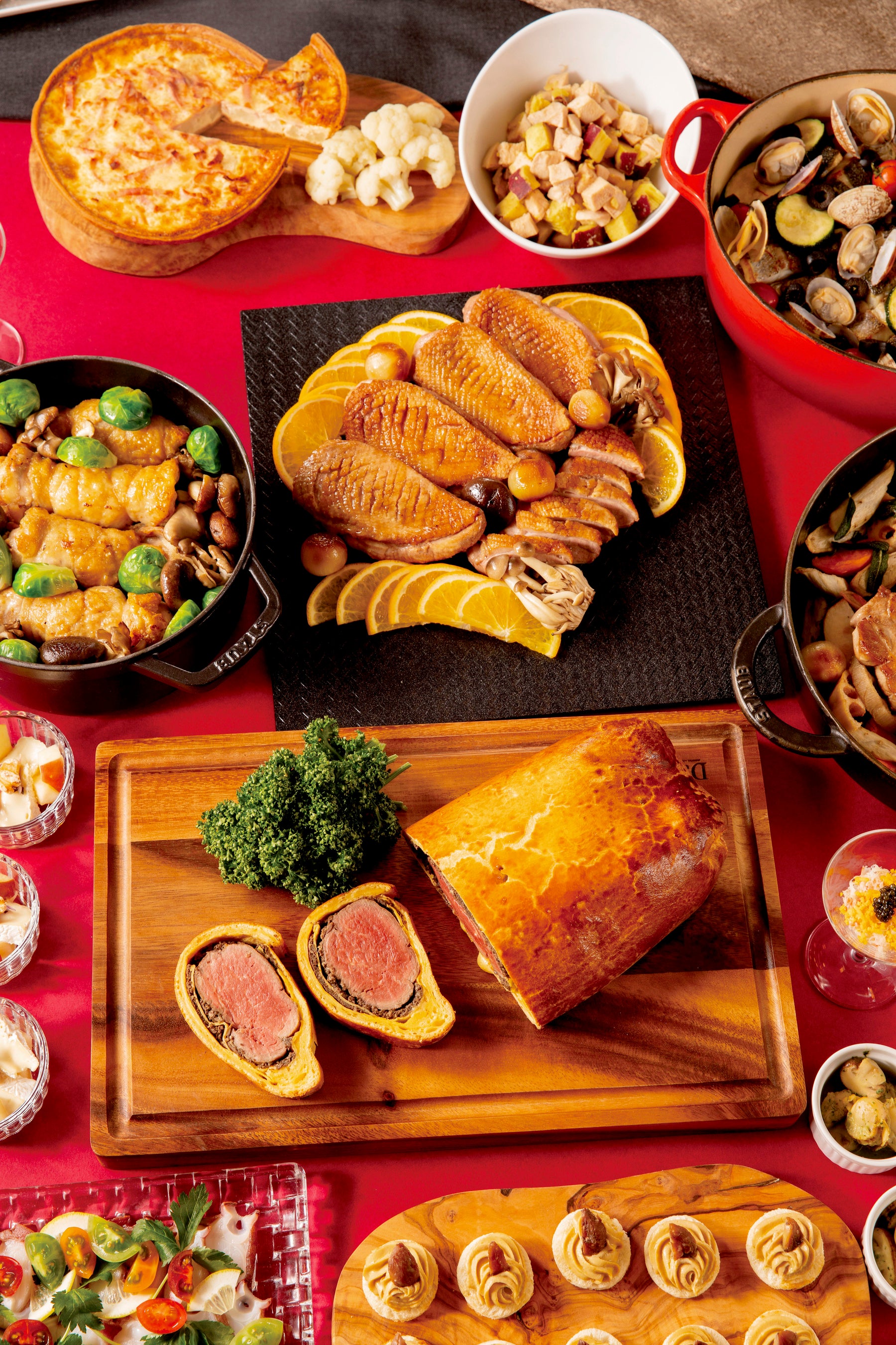 ジューシーなロゼに焼き上げ、優しい酸味とほろ苦いコクのあるオレンジソースを添えた鴨胸肉のロースト。上品な香りを持つサフラン風味のブイヤベースやブイヨンや生クリームで煮込み、まろやかなコクの帆立貝とマッシュルームのフリカッセ。洋酒につけたレーズンとナッツが練り込まれたシュトーレンや薪の形のブッシュ・ド・ノエルやツリーをイメージしたモンブランなどのスイーツ。