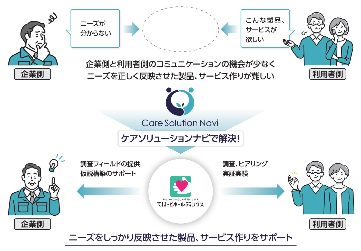 介護福祉事業を幅広く展開し、様々なフィールドを保持するては~とHDは、新商品開発を目指す事業者に対し、専門スタッフが有するノウハウの提供や、豊富なフィールドを活用し介護現場での実証実験を伴走サポートする「Care Solution Navi™」を2024年度より開始しました。利用者の状態や環境に合わせた用具を選定、提供する福祉用具専門相談員や福祉用具プランナーが、新商品開発の企画段階から試作開発、顧客現場でのモニタリング評価、さらには独自メディアでのプロモーションまでお手伝いし、事業化を強力に後押しします。