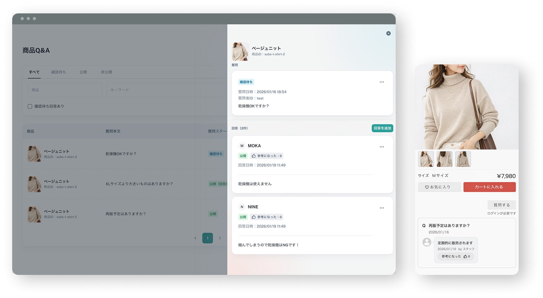 ユーザーは商品ページ上から、商品に関する質問を投稿できます。投稿された質問に対して、EC運営担当者や店舗スタッフが管理画面上から回答することで、購入前の疑問をその場で解消できます。