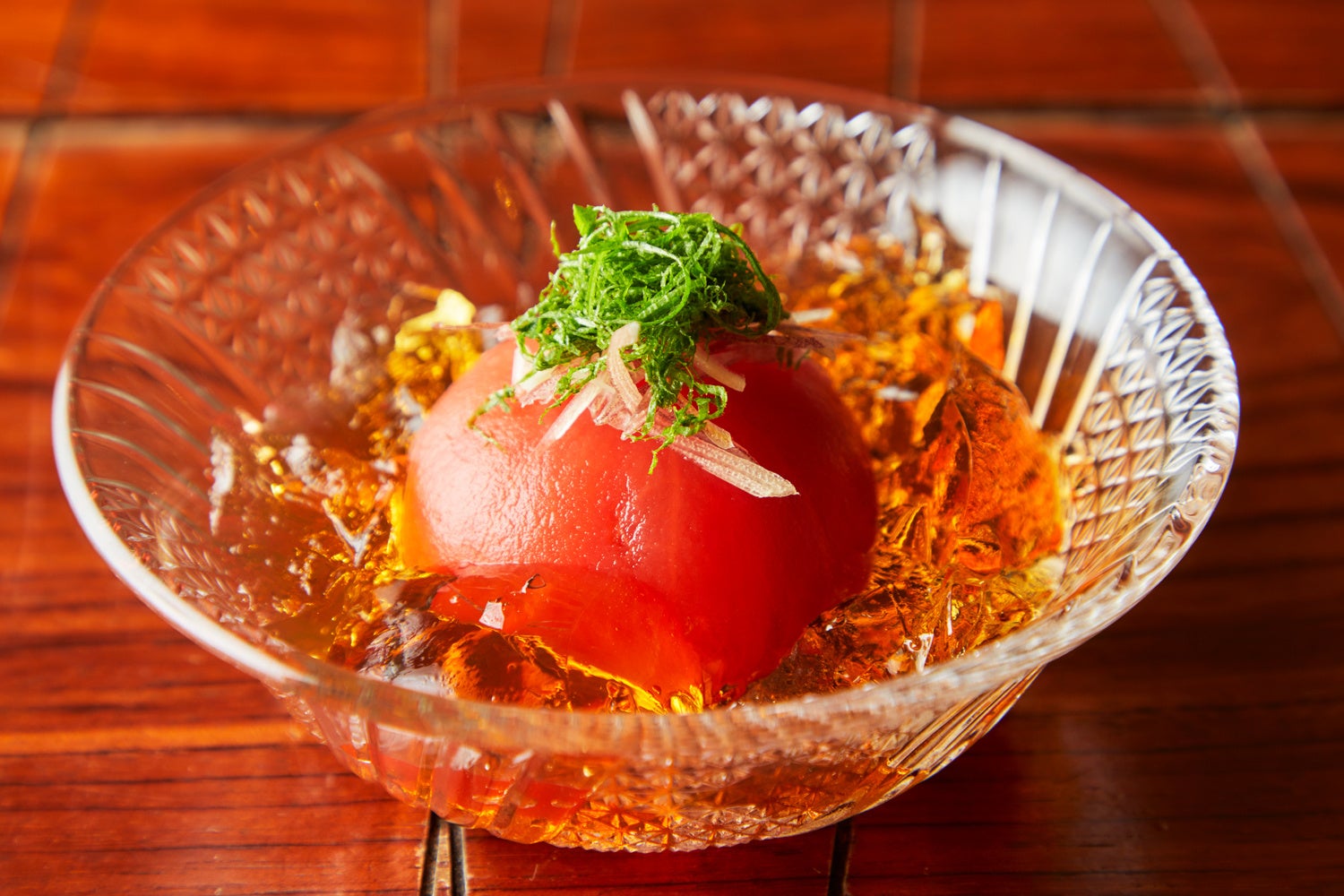 甘みたっぷりの冷やしトマトに、出汁の旨みが詰まった特製ジュレと一緒にお召し上がりください。