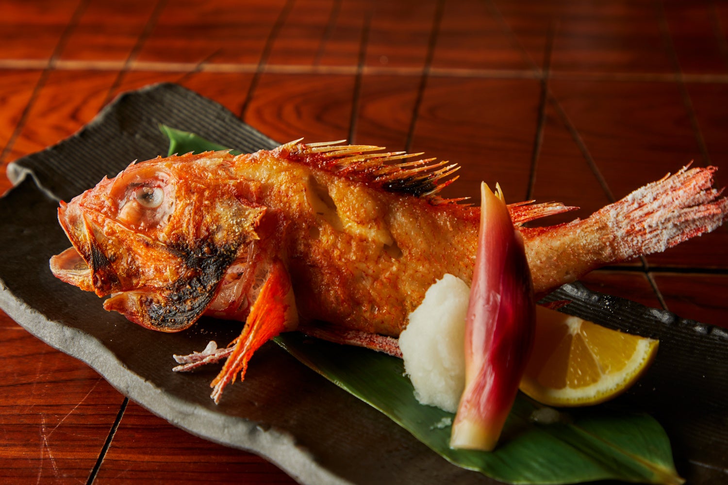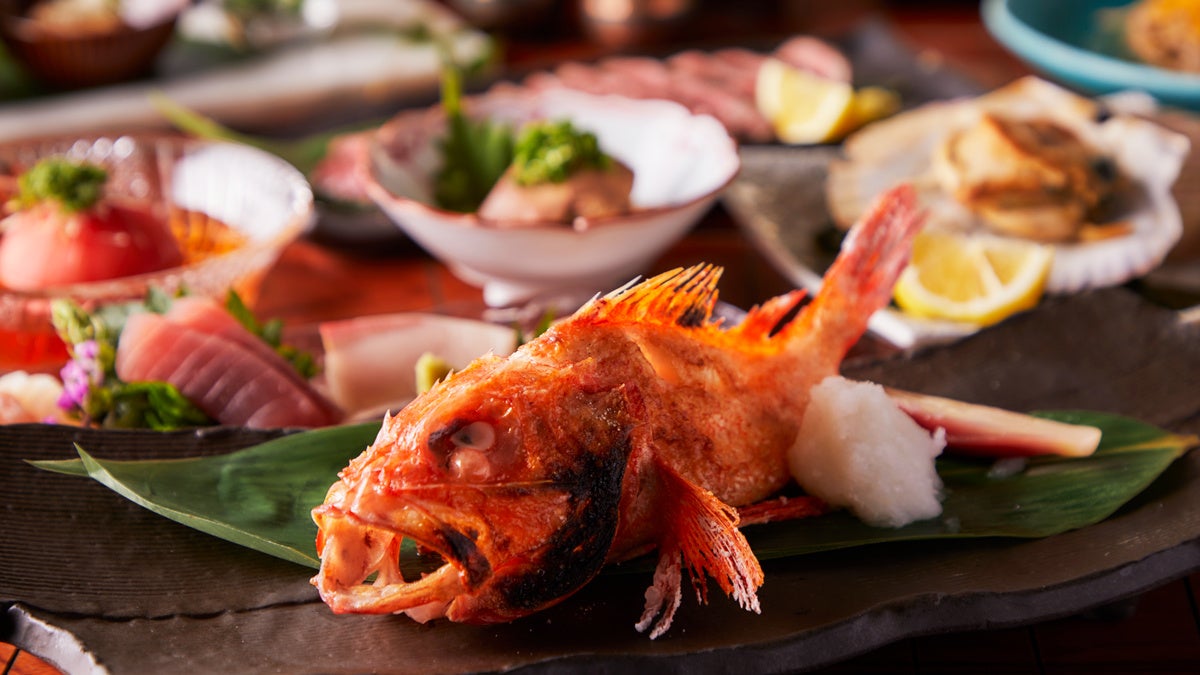 脂のり抜群の高級魚・北海道産キンキを豪快に一本丸ごと原始焼きで。遠火でじっくり焼き上げることで、表面は香ばしく、中はふっくらジューシー。キンキ特有の濃厚な旨みを存分に引き出した、贅沢な逸品です