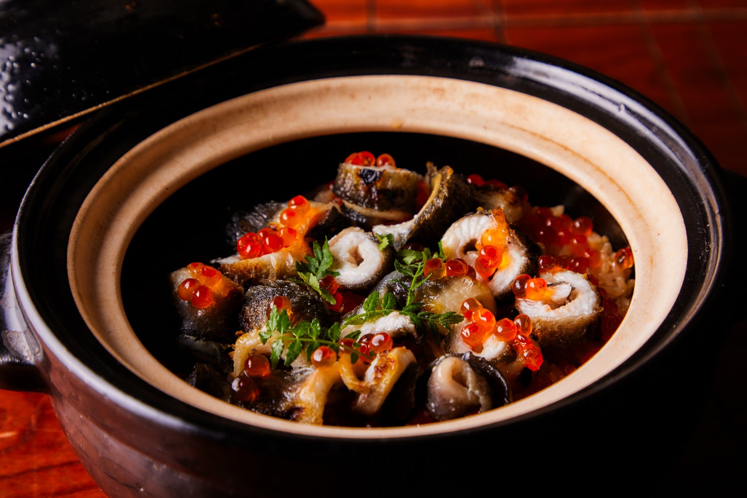 脂の乗った一色産うなぎの旨みが染み込んだご飯に、イクラの食感と塩味が絶妙に絡む、贅沢な土鍋ご飯です。