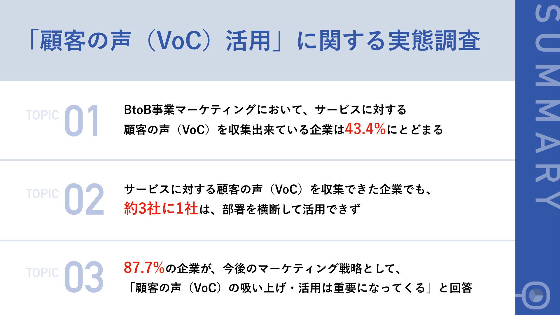 BtoBマーケ担当者の87.7%が、「今後顧客の声(VoC)の活用が重要になる」と回答。一方、約3社に1社は、部署を横断して顧客の声を活用できていない状況