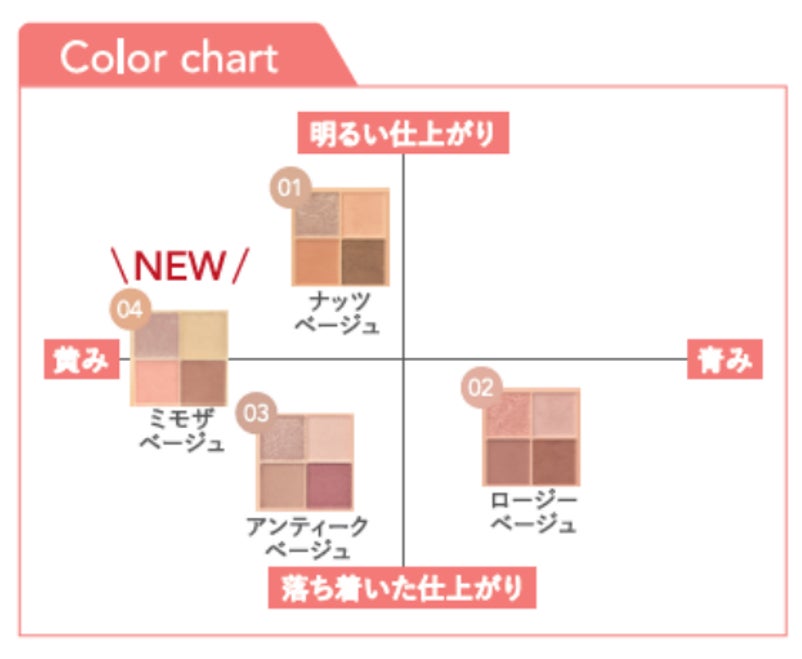 新色「04ミモザベージュ」は、柔らかいイエローとコーラルピンクの組み合わせで、多彩な表情を演出するこだわりの配色です。パステル調で柔らかいフェミニンな印象に仕上げつつ、質感違いの陰影でしっかりと目元を際立てます。同色系のレイヤード使いはもちろん、単色づかいもおすすめです。