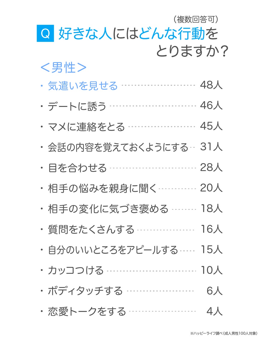 男性100人に「好きな人にはどんな行動をとりますか?」と質問したところ、「気遣いを見せる」が最多回答でした。