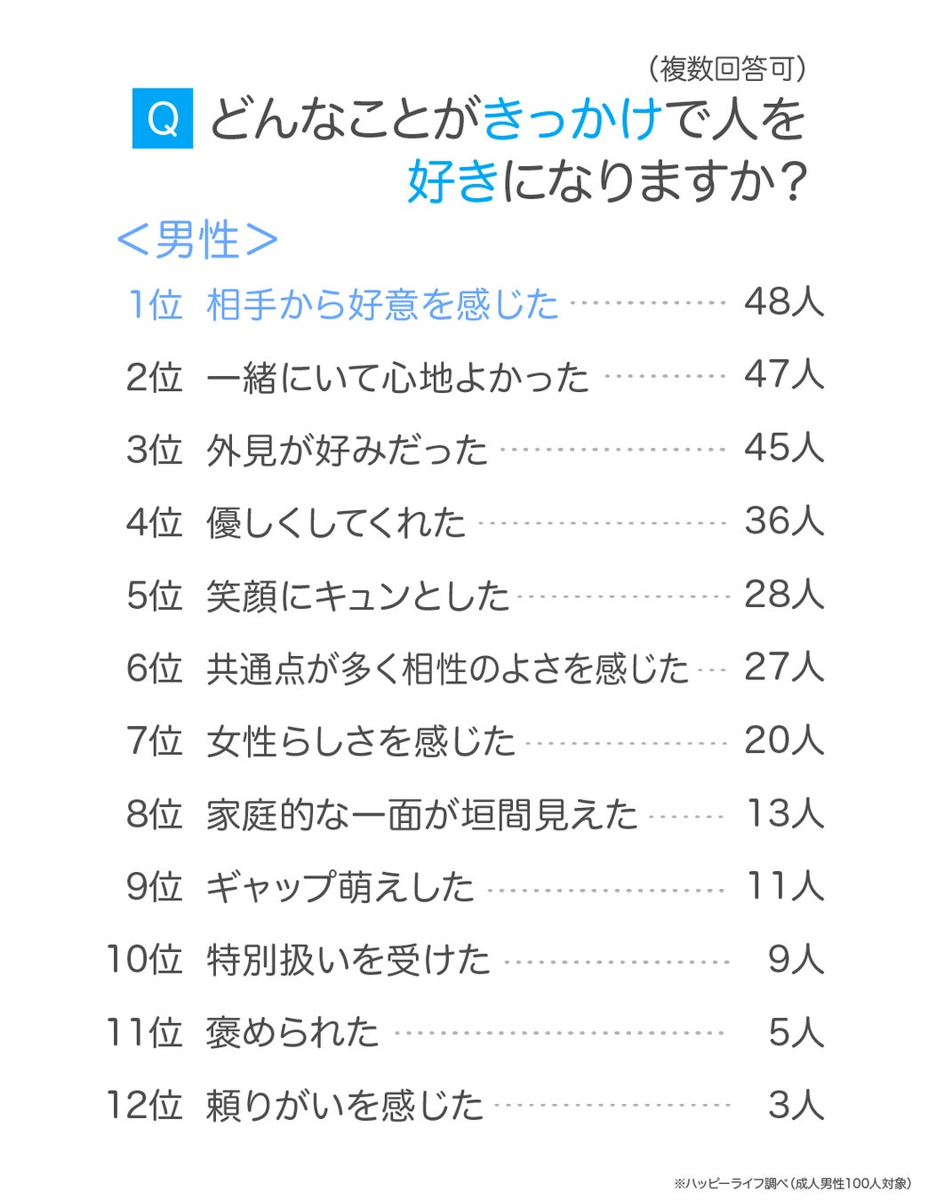 次いで2位は「優しくしてくれた」、3位は「相手から好意を感じた」となっています。