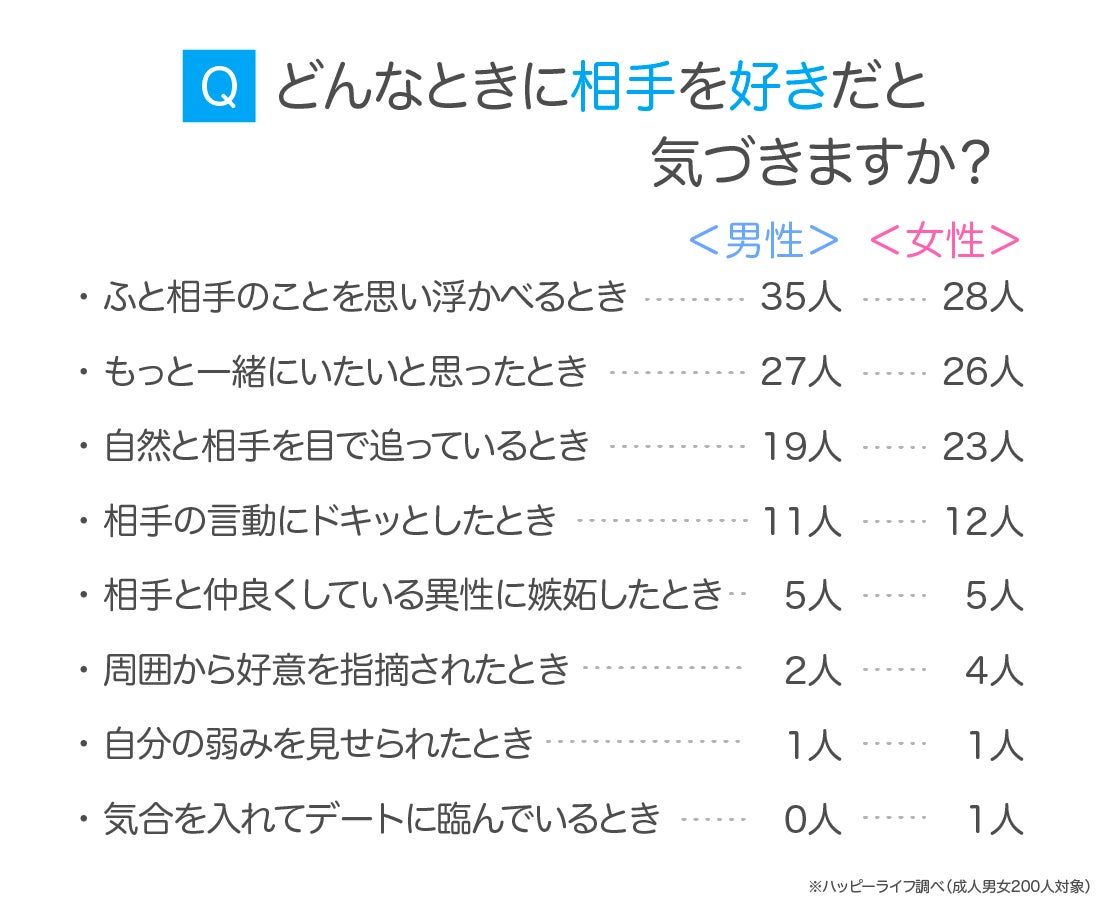 「どんなときに相手を好きだと気づきますか?」と質問したところ、男女ともに「ふと相手のことを思い浮かべるとき」が最多回答でした。