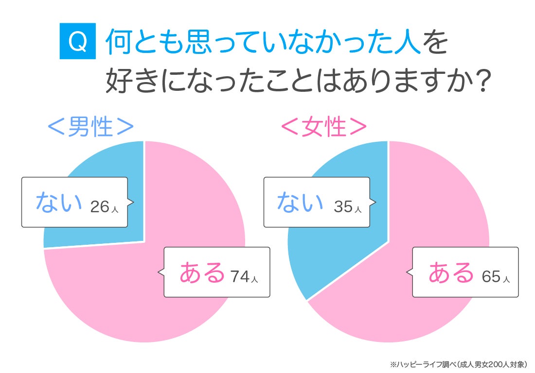 「何とも思っていなかった人を好きになったことはありますか?」と聞いてみたところ、「ある」と回答した男性は全体の約75%、女性は65%でした。