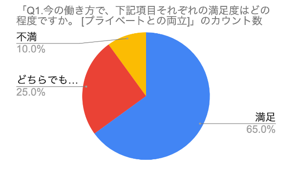 「満足」と答える人が65%と高い割合になっており、仕事とプライベートの両立が叶っている人が多いことがわかりました。