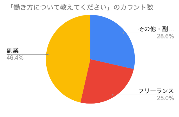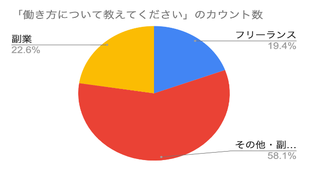 「副業・フリーランス」を合わせると、71.4%と実際に副業やフリーランスで働いている方が多いということがわかりました。