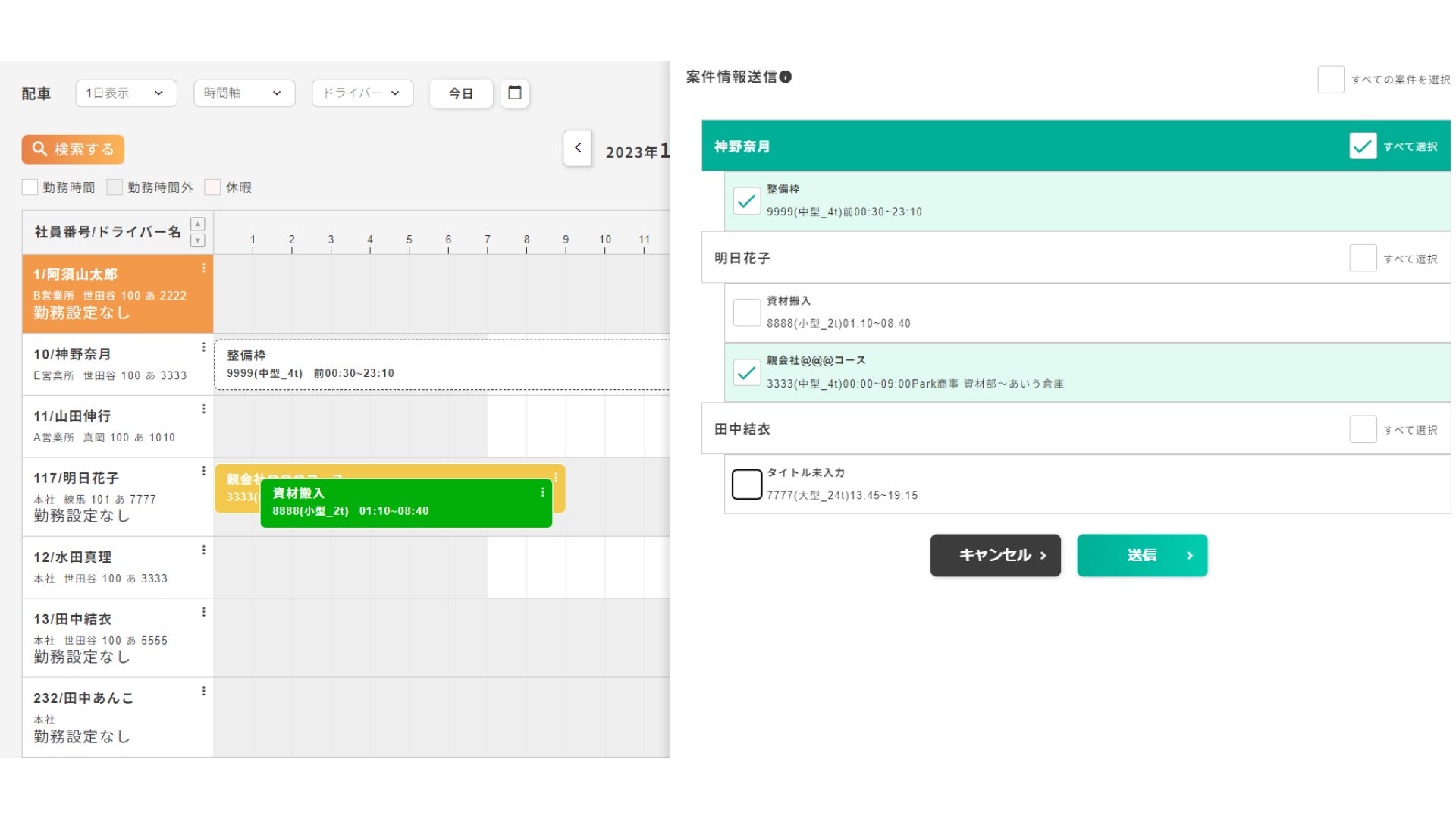 配車表上からドライバーに通知したい案件を選択し、送信ボタンを押すだけで、案件情報をドライバーに対してSMSで通知できるようになりました。