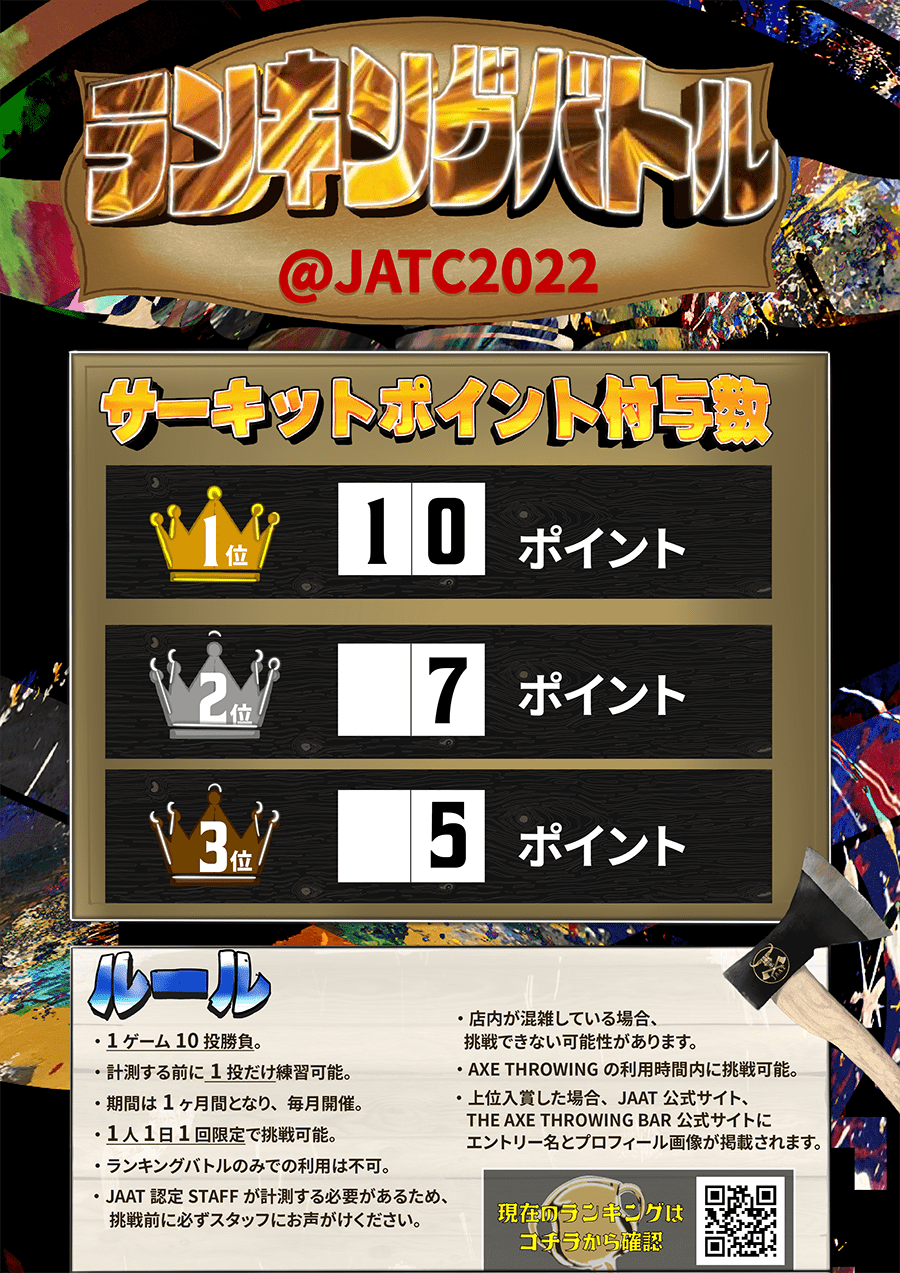 「斧投げ 月間ランキングバトル@JATC2022」とは、全国のAXE THROWER(斧投げ愛好家)同士が、1ゲーム10投のスコアを月間で競い合う、ランキングバトルのことです。開催期間は、2022年5月1日から10月31日となり、開催期間中に一般社団法人日本アックススローイング協会の加盟店舗で毎日開催され、月間で集計を行います。月間ランキングで見事上位3名にランクインした場合、斧投げ日本一決定戦。"Japan Axe Throwing Championship 2022 @TOKYO" への出場権を獲得するために必要なサーキットポイントを貯めることができます。