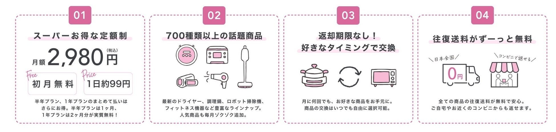 一般的なレンタルサービスの場合、返却期限内に返さなければいけないストレスと、利用期間が長いほど高額になってしまうジレンマがつきまといますが、『アリスプライム』の場合、返却期限も追加料金も発生しません。レンタルに伴うストレスをできる限り排除した全く新しいシェアリングサービス「アリスプライム」で、“豊かな暮らし”をぜひご体験ください。