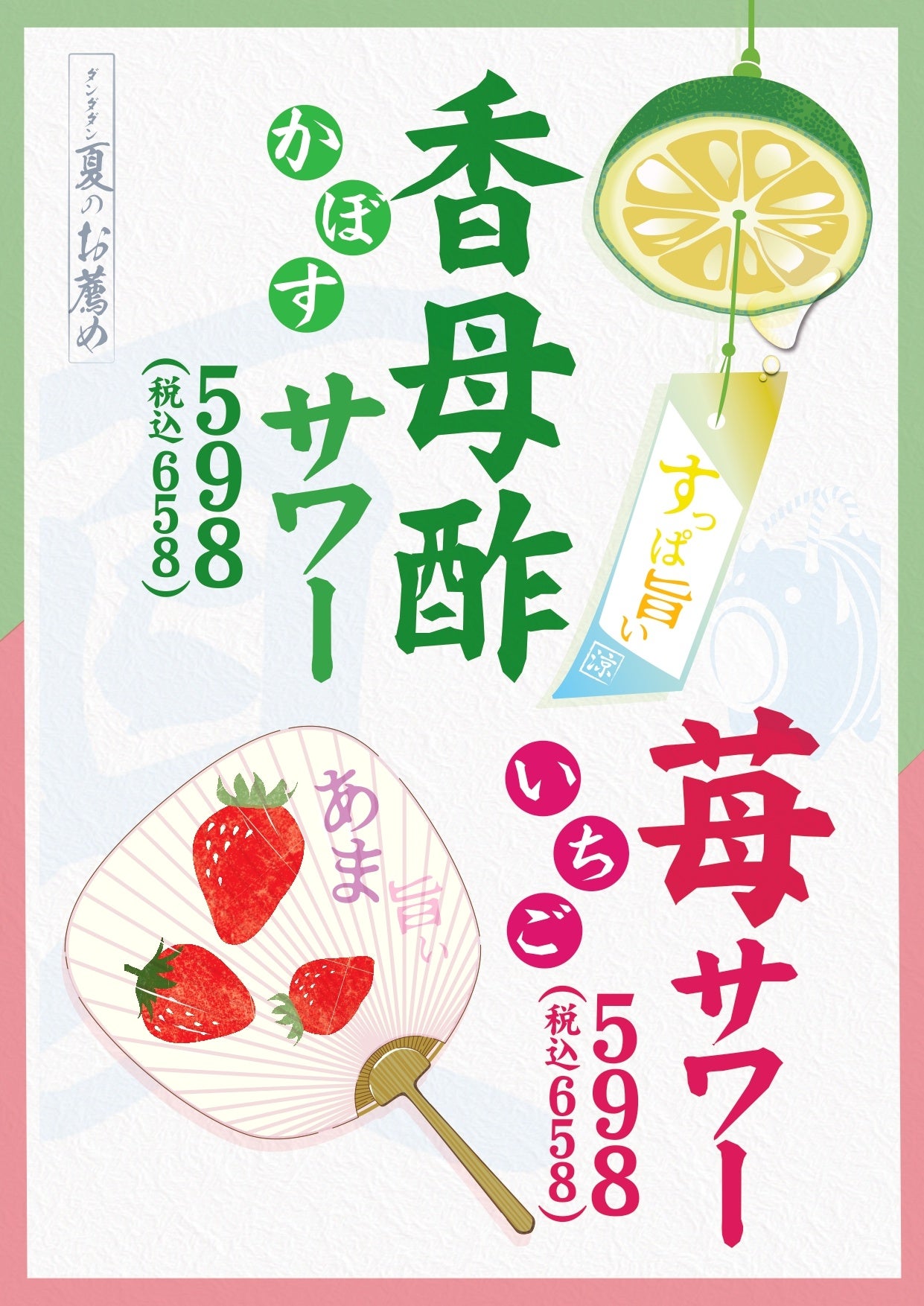 この度、夏にぴったりのすっぱ旨いお酒「香母酢(かぼす)サワー・苺(いちご)サワー」を7/1~8/31の間、全131店舗※でご提供します。