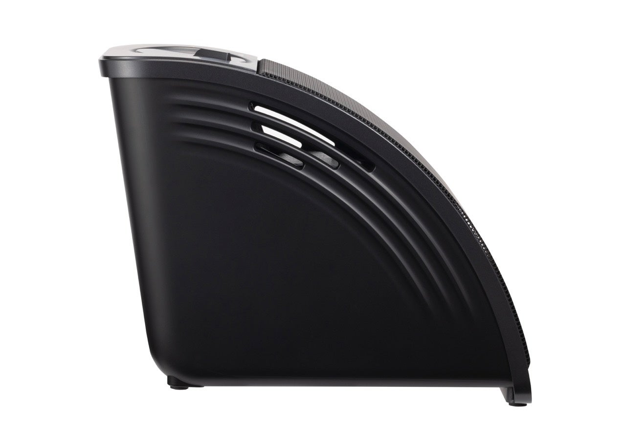 曲面サウンドらしい扇形のフォルムはそのままに、正面から見るとテレビの視聴を邪魔しない黒い長方形に見えるシンプルでスタイリッシュなデザインに。