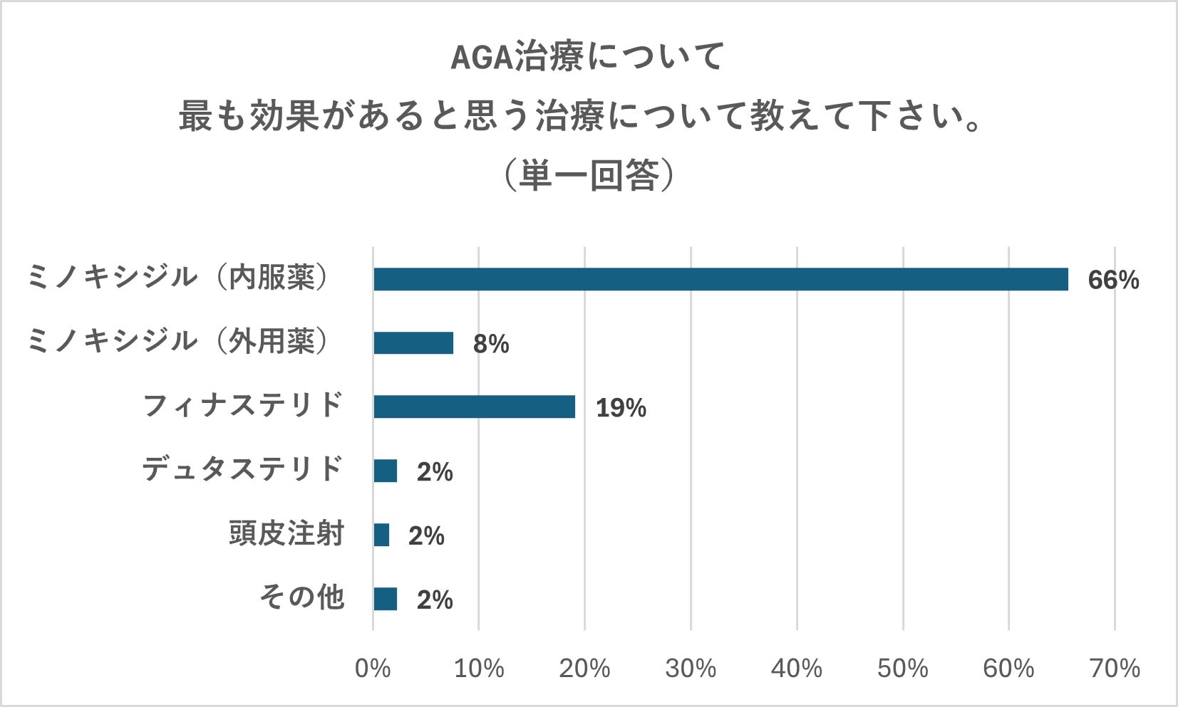 まず「現在、行っているAGA治療について教えて下さい(複数回答)。」と質問したところ、「ミノキシジルの内服薬」と回答した人が81%と最も多い結果となり、次に「フィナステリド(63%)」、「ミノキシジルの外用薬(49%)」の投薬治療と続きました。さらに、「AGA治療について、最も効果があると思う治療について教えて下さい。」という質問に対しても、「ミノキシジルの内服薬」と回答した人が66%、次に「フィナステリド(19%)」、「ミノキシジルの外用薬(8%)」の投薬治療が並びました。