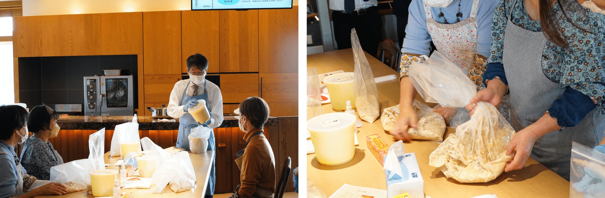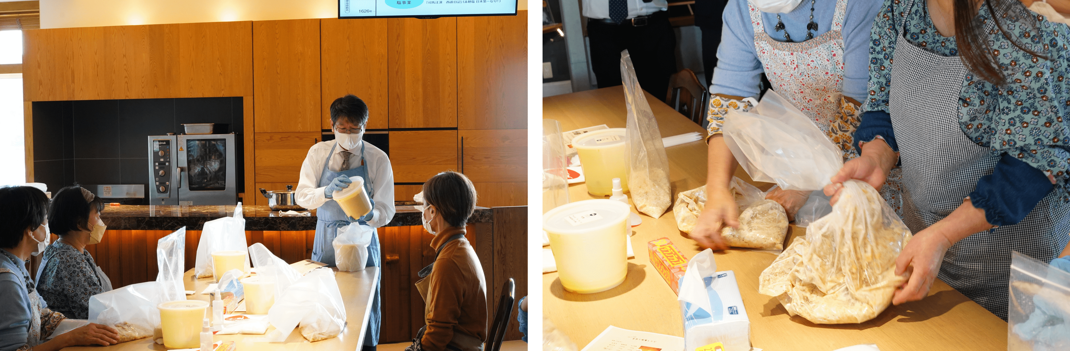 工場見学の後に、天塩スタジオにてワークショップを行いました。本ワークショップでは、大豆から味噌を作るため、大豆を潰し、塩入り麹を作るところから体験することができます。また、1から作ることができるので、豆の食感を残したりなめらかな仕上がりにしたりと、自分好みの味噌を作ることができます。みなさんそれぞれ好みの出来上がりを想像し、味噌作りを楽しみました。今回は味噌作りでしたが、普段は塩づくりや梅干し作りのワークショップも開催しています。