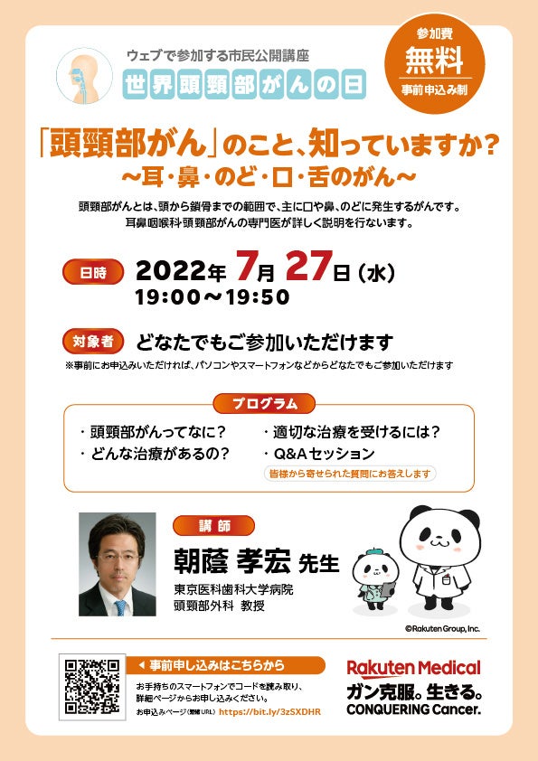 楽天メディカル、7月27日「世界頭頸部(とうけいぶ)がんの日」に、オンライン市民公開講座「『頭頸部がん』のこと、知っていますか?〜耳・鼻・のど・口・舌のがん〜」を開催