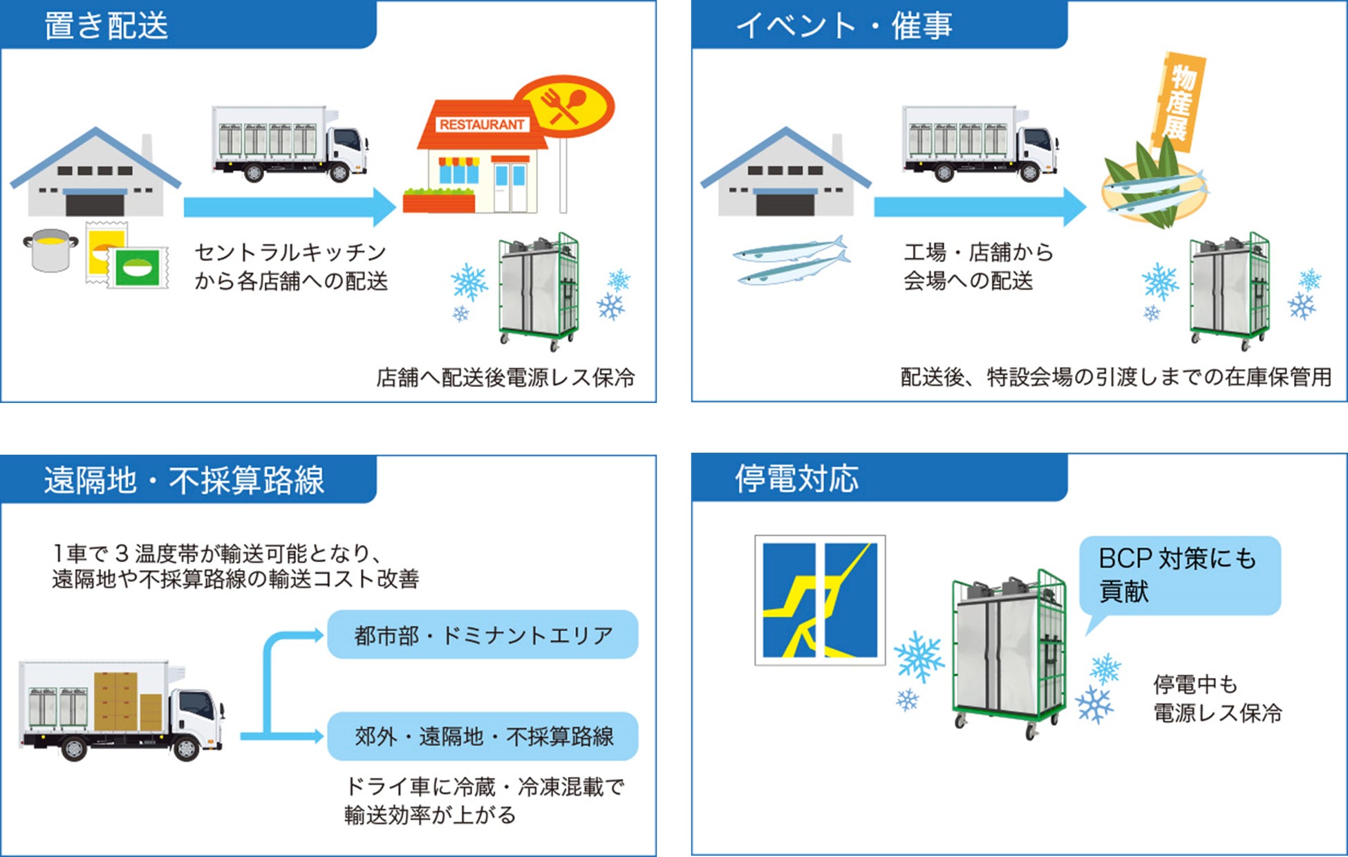 「レボクール・カーゴ」は、① 置き配送機能(セントラル・キッチン→各店舗) ② イベント・催事での活用 ③ 遠隔地・不採算路線での活用 ④ 停電対応 などさまざま場面での活用が可能です。