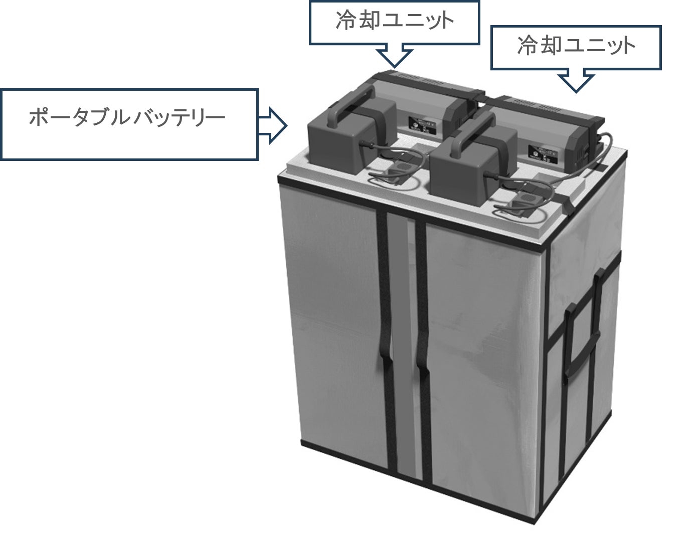 ※「レボクール・カーゴ」は、上部に冷却ユニットおよびポータブルバッテリーを配置して使用します。尚、レボクール・カーゴは実際にはカゴ車に搭載して使用することを想定しています。