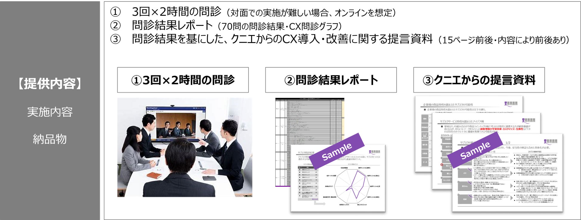 本サービスでは事業のCXを設計・改善したい/適切な指標・評価制度を設計したい企業に対し、クニエのコンサルタントが独自開発した「CX問診ツール」を用いて網羅的に問診・診断することで、競争力のあるCX設計や制度設計を支援するものです。料金は45万円(税別)、期間は約1.5カ月 (週1回の問診ペースの場合)*1 で提供します。