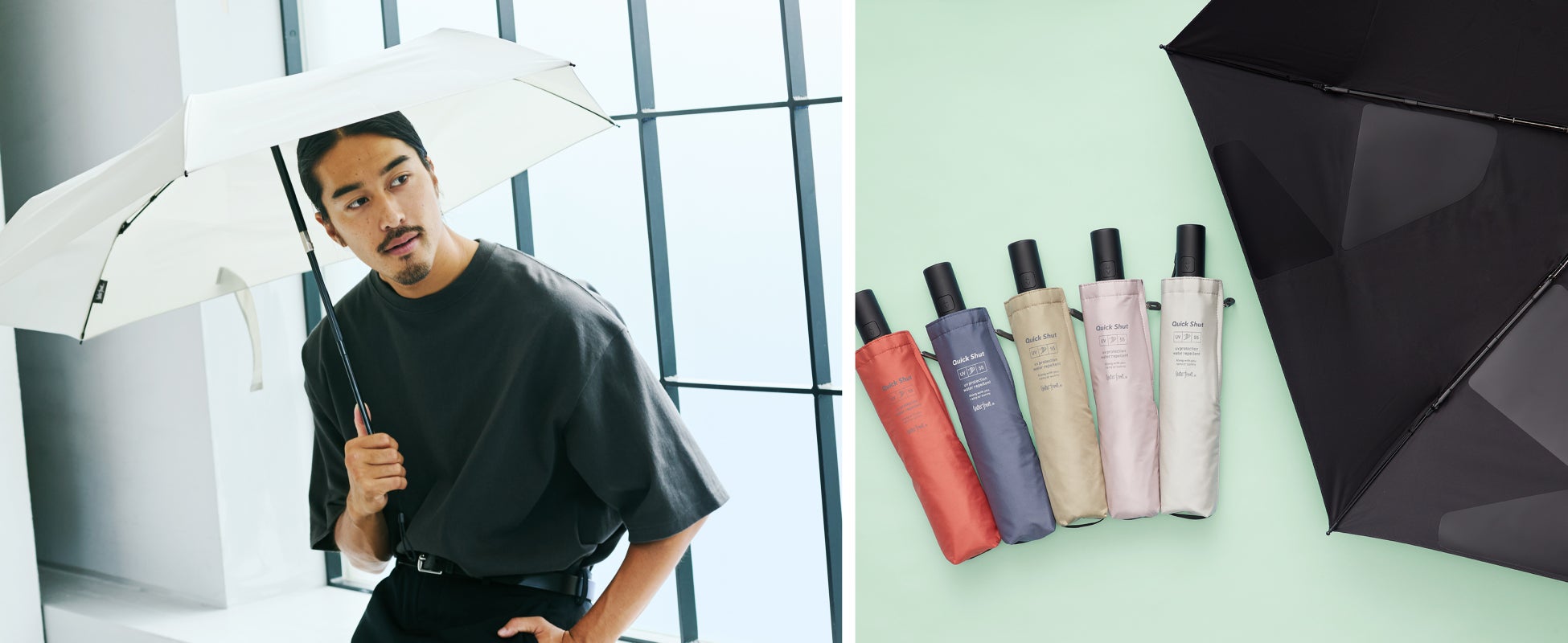 近年、日傘を利用する男性も増え、ビジネスシーンにもマッチするシンプルなデザインの傘が注目を集めています。「クイックシャット」シリーズは、形態安定のシェイプメモリー機能で使用後もスムーズにたためるよう設計されたストレスフリーな閉じ心地が特長です。忙しい通勤時でも、ボタン一つでさっと開閉できる自動開閉タイプや、UVカット・遮光・遮熱・撥水機能を持った晴雨兼用タイプなどバリエーションも豊富。使う人の立場に立って企画された思いやりのアイテムです。