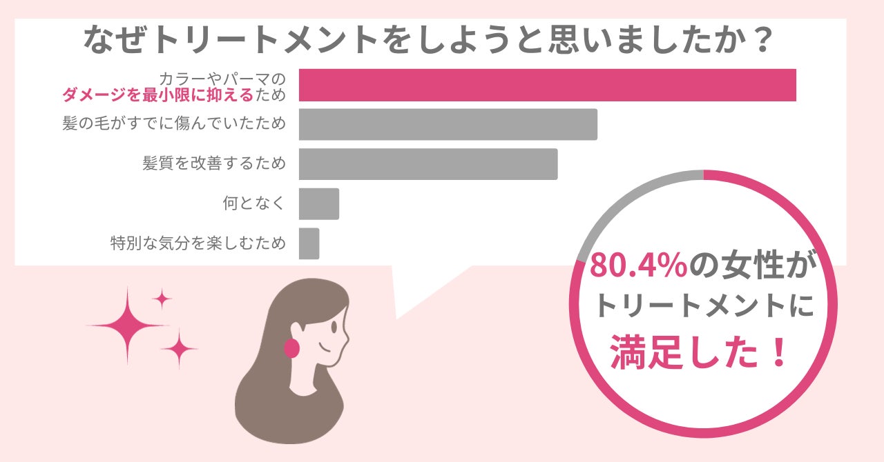 美容院でのトリートメントは高価ですが、多くの女性が「カラーやパーマのダメージを最小限に抑えるため」にトリートメントをすることがわかりました。また、80.4%の女性が美容院でのトリートメントに満足したことも明らかになりました。