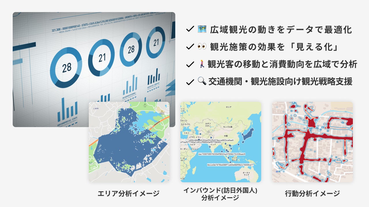 広域エリアでの観光客の移動パターンや主要な立ち寄りポイント、交通手段、消費動向を包括的に分析するサービスです。