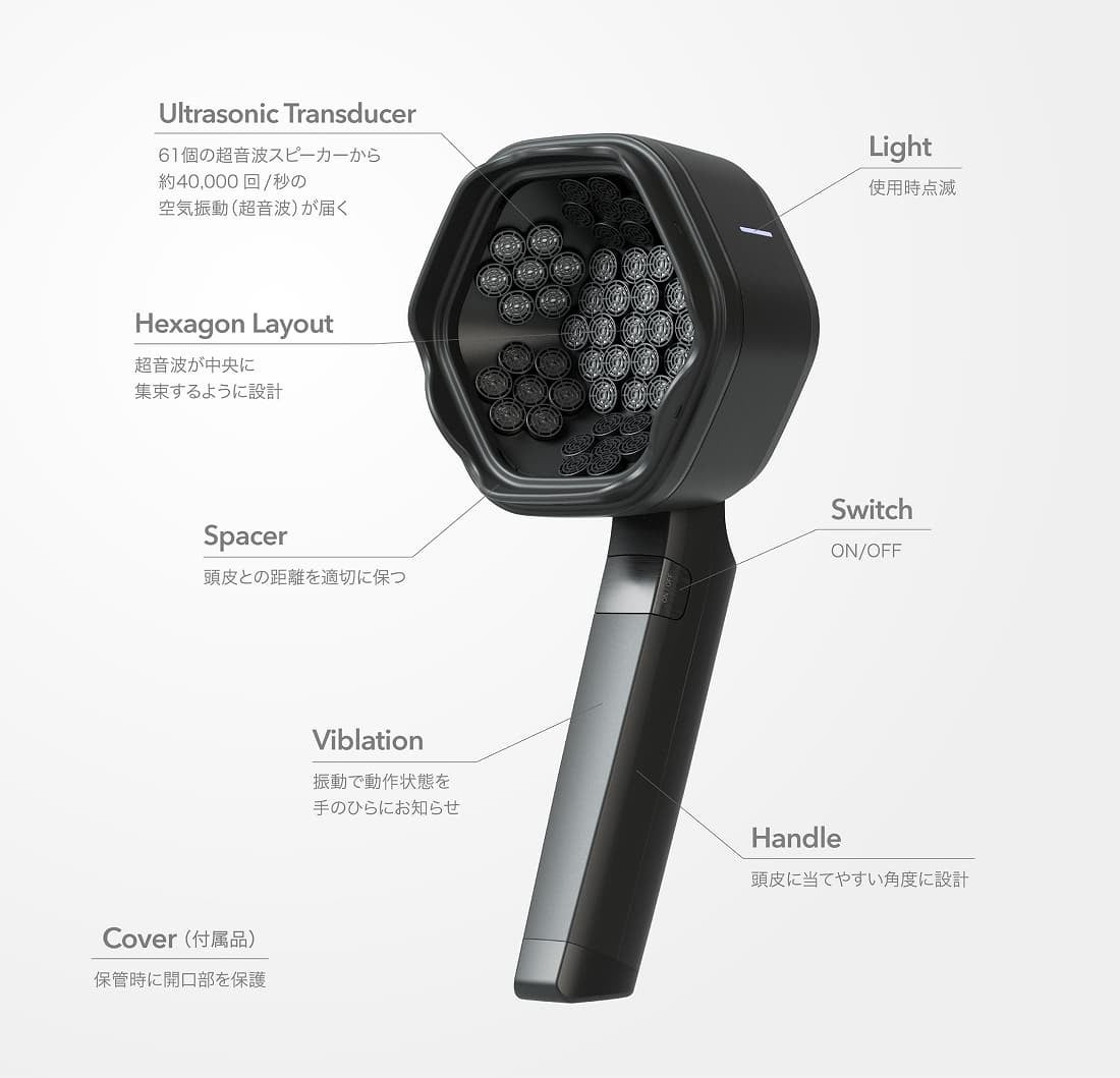 独自開発の技術「非接触振動圧刺激」は、空中を伝わる超音波を利用して非接触で皮膚を刺激する技術です。独自のヘキサゴン構造によって、デバイスに搭載された61個の超音波スピーカーが発する超音波を集束させ、効率的に頭皮を刺激します。