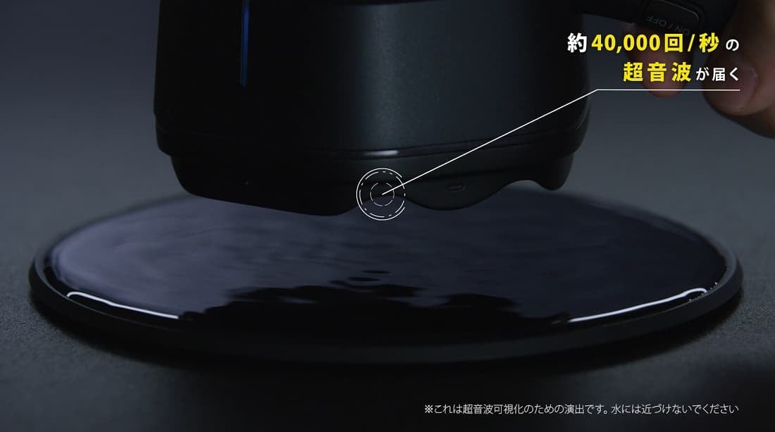 約40,000回/秒の音(空気の振動)を振幅変調させ、デバイスから非接触で皮膚に届かせます。動作音は静かで、周囲を気にせずお使いいただけます。