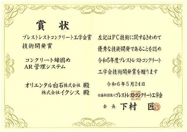 株式会社イクシス(本社:神奈川県川崎市、代表取締役 Co-CEO:山崎文敬、狩野高志)ならびにオリエンタル白石株式会社(本社:東京都江東区、代表取締役社長:大野達也)は公益社団法人プレストレストコンクリート工学会より「令和5年度 プレストレストコンクリート工学会賞 技術開発賞」を授与されました。「プレストレストコンクリート工学会賞 技術開発賞」はプレストレストコンクリート構造物の新設・改築・改修の設計施工に対し創意工夫に富み、プレストレストコンクリート技術の進歩、発展または普及に顕著な貢献をしたと認められる実用化技術を開発した者を対象に表彰されるものです。