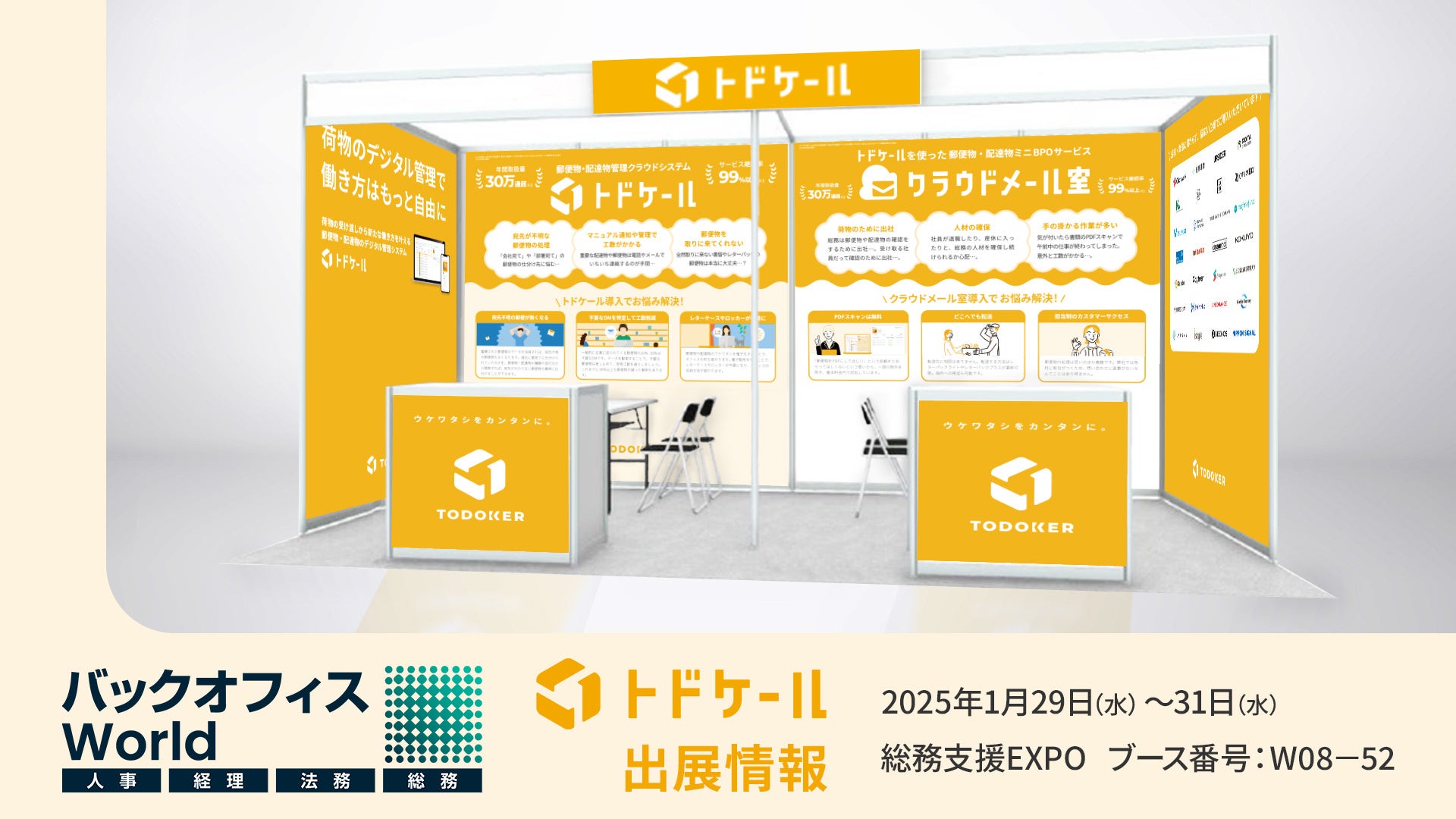 オフィスにおける郵便物・配達物管理SaaS「トドケール」を運営する株式会社トドケール(本社:東京都千代⽥区、代表取締役:野島剛、以下トドケール)は、2025年1月29日(水)〜1月31日(金)の3日間にわたって東京ビッグサイトで開催される『バックオフィス World 2025 春 東京』に出展します。本展示会は人事・経理・総務・法務向けの専門展で構成されており、トドケールは「総務支援EXPO」に出展します。